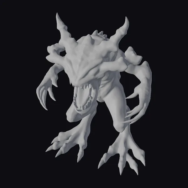 This fearsome creature stands poised, its purple and green hues radiating an eerie glow. The creature’s sharp, clawed hands are extended, as if ready to pounce. Its mouth is wide open, revealing rows of razor-sharp teeth, while its glowing blue eyes seem to pierce through the darkness. The creature’s body is a mass of twisted, muscular tissue, with two curved horns protruding from its forehead. Its very presence seems to command attention, as if it’s a harbinger of doom from another realm. Bring this creature to life in your games, animations, or designs with this highly detailed 3D model.