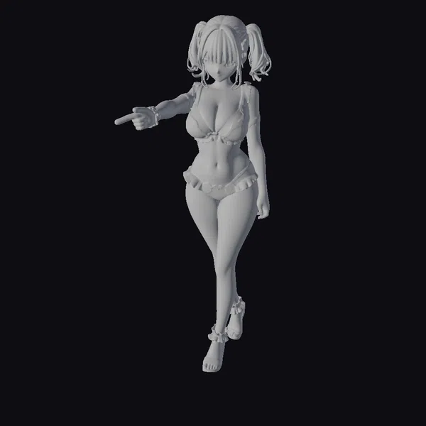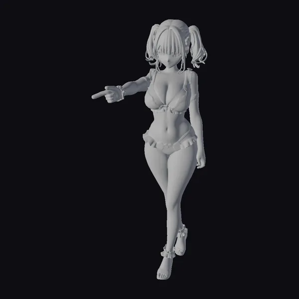 Rendered in exquisite detail, this stylized anime character boasts a mesmerizing purple bikini that glistens with a subtle sheen, perfectly capturing the light. Her green hair, styled in twin tails, adds a pop of color and playfulness to her overall appearance. With a dynamic pose that exudes confidence, she points with a carefree gesture, as if inviting you into her world. Her shiny skin and glossy fabric textures bring a sense of realism to her cartoonish charm. This model is perfect for projects requiring a lively, eye-catching character, whether for animation, game development, or virtual reality experiences.