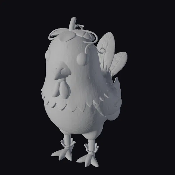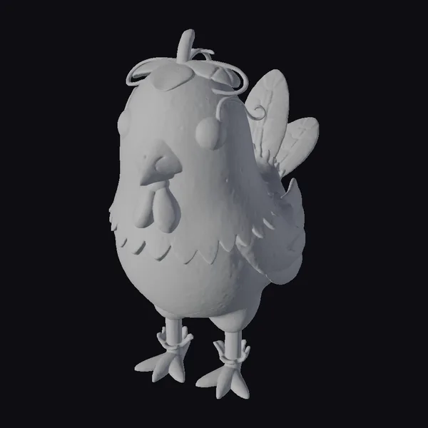 Detailed with precision, this stylized model showcases a chicken-passionfruit hybrid with a rich, purple body speckled with white spots, giving it a slightly textured, fruit-like appearance. The addition of green leaves on its head and ankles, along with butterfly wings, enhances its fantastical appeal. The model features a bright orange beak and feet, adding a pop of color to its overall design. Its large, round eyes are a striking black, contributing to its endearing and curious expression. This model is perfect for projects requiring a touch of whimsy and fantasy, such as animations, games, or conceptual designs. Its unique design ensures it stands out, making it an excellent choice for creators looking to add a bit of magic to their work.