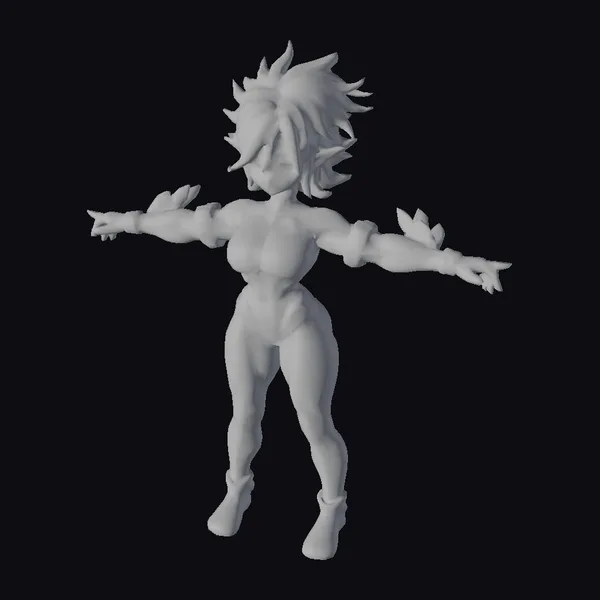 Detailed with precision, this stylized elf warrior boasts a vibrant purple and black armor set that highlights her toned physique. Her hair is styled in a spiky fashion, complementing her sharp, pointed ears and purple eyes. With arms outstretched, she appears ready to harness her magical abilities or leap into battle. The intricate design of her armor and the fluidity of her pose make her a compelling addition to any fantasy or sci-fi project, suitable for games, animation, or 3D printing.
