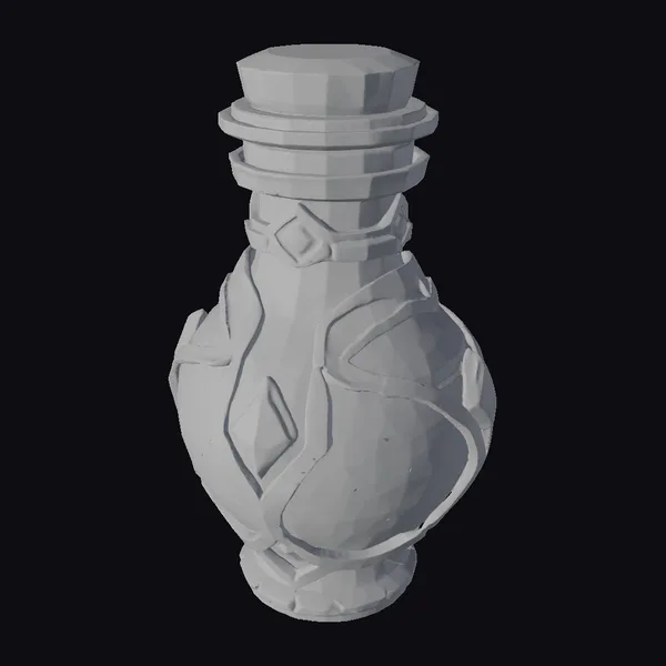 The purple elixir bottle stands tall, its bulbous body adorned with intricate metallic filigree that wraps around the glass like twisted vines. The bottle’s stopper, crafted from a darker metallic material, adds a sense of contrast to the overall design. As light dances across the bottle’s surface, the glowing purple liquid within seems to shift and swirl, casting an ethereal glow. The metallic accents, a warm golden hue, add a sense of opulence to the overall design. This 3D model would be perfect for use in games, animation, or 3D printing, where a touch of mysticism and luxury is required. Designers and artists can utilize this model to add a sense of ancient wisdom and mystique to their projects.