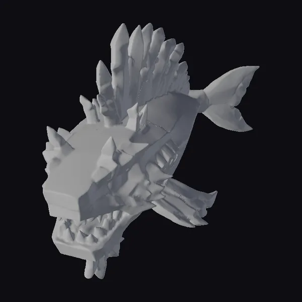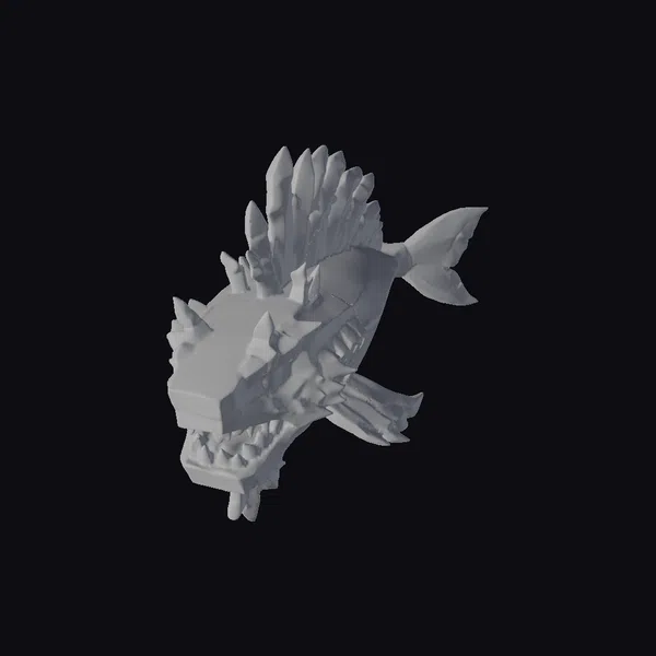 This fantastical creature presents a formidable appearance, with a large head dominated by a mouth full of sharp, white teeth and a single, glowing yellow eye. The body is primarily a deep, rich purple, covered in sharp, spiky scales that run along its back and fins. Horizontal cyan stripes contrast beautifully against the purple, adding to the fish’s mystical aura. The fins and tail are tipped with a softer, more translucent cyan, suggesting a bioluminescent quality. The overall effect is one of a fearsome predator from the depths of a fantasy world. Ideal for use in animation, games, or as a unique design element, this model is sure to capture attention.