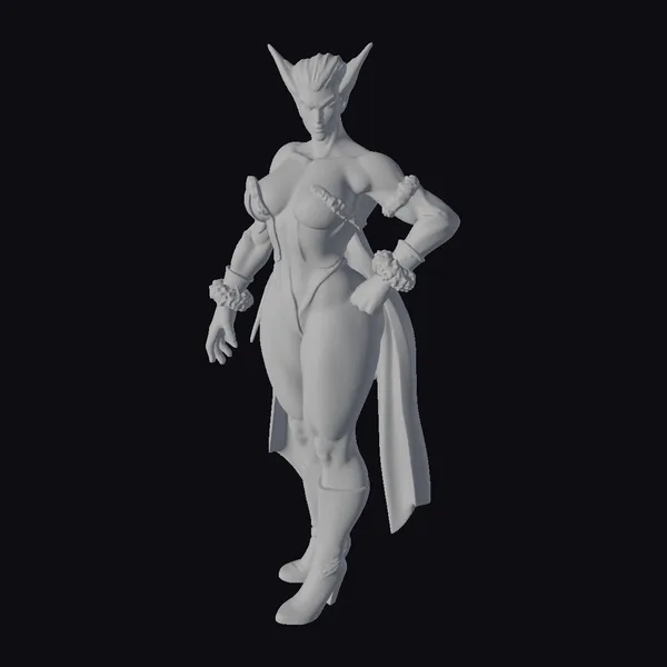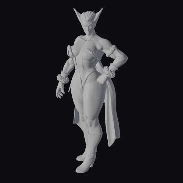 Standing confidently with one hand on her hip, this stylized female warrior exudes an aura of strength and mystique. Her purple skin and hair, styled in sharp, pointed ears, contrast dramatically with her green and pink armor, complete with fur-trimmed cuffs and a long, flowing cape. The intricate details of her costume, from the fur accents to the sleek boots, invite you into a world of fantasy and adventure. Her gaze, directed downwards, adds an air of mystery and readiness. This model is perfect for bringing a touch of fantasy and heroism to games, animations, or any creative project in need of a strong, stylized character.