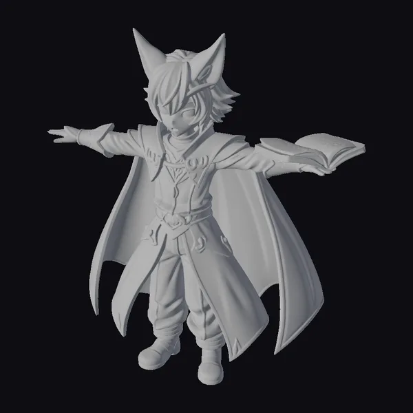 Detailed in every aspect, this stylized purple fox mage stands confidently, one hand extended and the other holding an open book, as if casting a spell or reading ancient incantations. The character’s white and purple robe flows dynamically, with intricate details and a contrasting belt that accentuates the waist. The fox ears, a striking feature, add a touch of whimsy and fantasy. The model’s vibrant colors and detailed textures make it perfect for use in animations, games, or virtual reality experiences, where a magical and mystical atmosphere is desired.