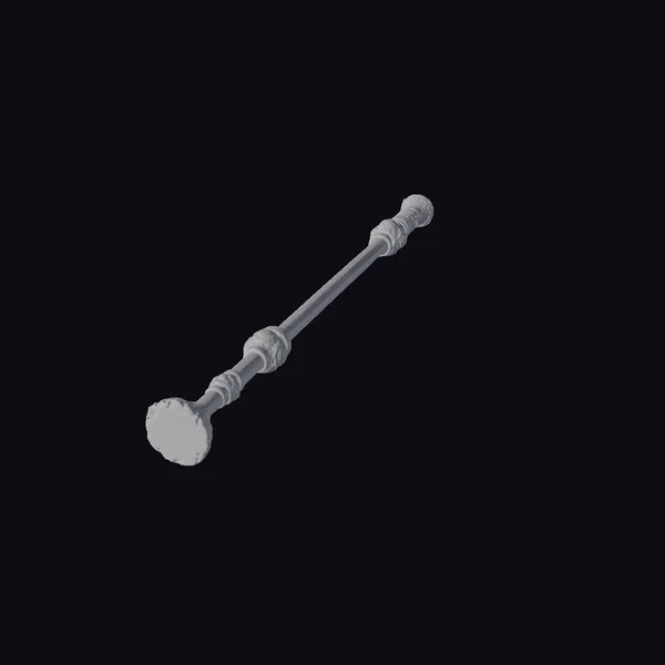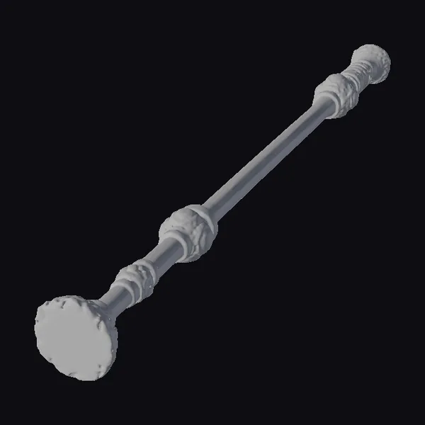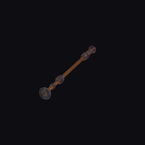 Positioned dynamically against a neutral backdrop, the wand’s detailed texture and coloration leap to life. The shaft, a warm, earthy brown, contrasts beautifully with the cool, rich tones of the purple gemstones and metallic accents. As light dances across its surface, the wand’s engraved handle shimmers, drawing the eye to its exquisite craftsmanship. Whether destined for a fantasy game, animation, or virtual reality experience, this wand promises to channel magic with elegance and authority. Its creation, a blend of artistic vision and technical precision, results in a prop that’s as functional as it is beautiful.