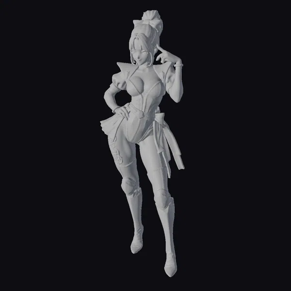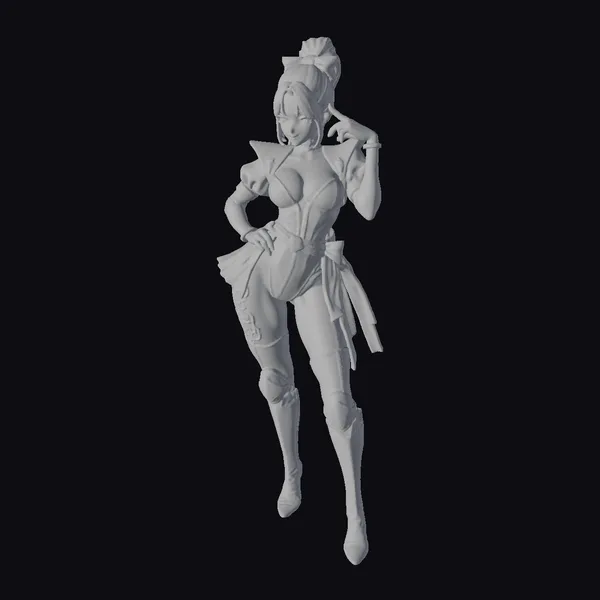 Gaze upon the intricate details of this stylized anime character, posed dynamically with one hand on her hip and the other elegantly raised to her face. Her outfit is a masterclass in contrast, with sleek black and deep purple hues accented by gold, and complemented by knee-high black boots that add a touch of edginess. The character’s facial features are delicately rendered, with a subtle smile and expressive eyes that seem to sparkle with mischief. This model is perfect for bringing a touch of anime flair to games, animations, or virtual reality projects.