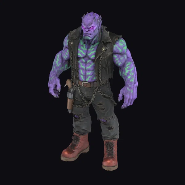 Standing imposingly, this purple-skinned alien warrior showcases intricate green glowing patterns across its muscular physique. The creature’s sharp, spiky hair and intense gaze convey a sense of formidable strength and aggression. Clad in a tattered black vest and pants, held together by chains and a brown belt, the warrior’s attire is as imposing as its physique. Red boots add a pop of color to its dark, battle-ready ensemble. A gun holstered at its hip suggests a readiness for combat. This detailed model is perfect for projects requiring a strong, sci-fi character, such as games, animations, or virtual reality experiences.