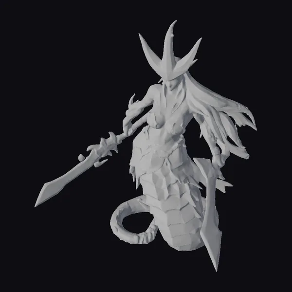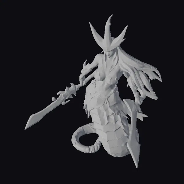In a dynamic pose that exudes both strength and agility, this naga warrior stands with her body transitioning from humanoid torso to serpentine tail, covered in overlapping purple scales that shimmer under the light. Her long, flowing hair flows like the wind, complementing her fierce demeanor. Adorned in intricate armor that includes a breastplate, arm guards, and a helmet with two pointed protrusions, she embodies a mythical creature of legend. The dual wielding of a spiked mace and a dagger adds to her formidable appearance, suggesting a versatility in combat. The model showcases detailed textures, from the shine on her scales to the metallic gleam of her weapons, making it suitable for use in games, 3D printing, VR/AR experiences, animation, and design projects.