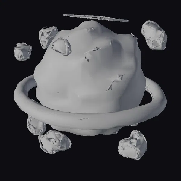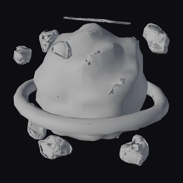 Floating dynamically against a stark white backdrop, a radiant purple planetoid takes center stage, its surface a complex interplay of light and shadow. The planet’s irregular shape and texture evoke a sense of a distant, uncharted world. A glowing purple ring encircles the planetoid, adding a pop of color and depth to the scene. Eight rocks, each with its own unique shape and texture, are scattered around the planet, emitting a soft, ethereal glow. The combination of these elements creates a visually stunning representation of a sci-fi environment, perfect for use in games, 3D printing, VR/AR experiences, animation, and design projects. The high level of detail and realism makes this model suitable for a wide range of applications.