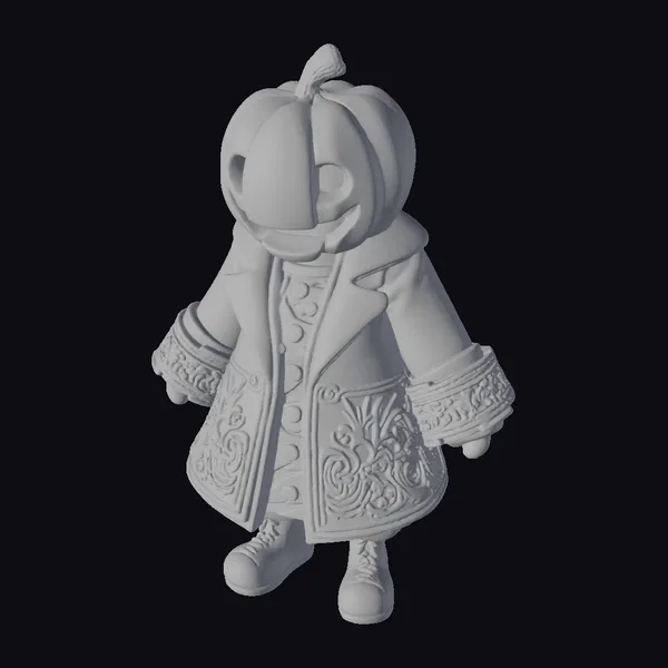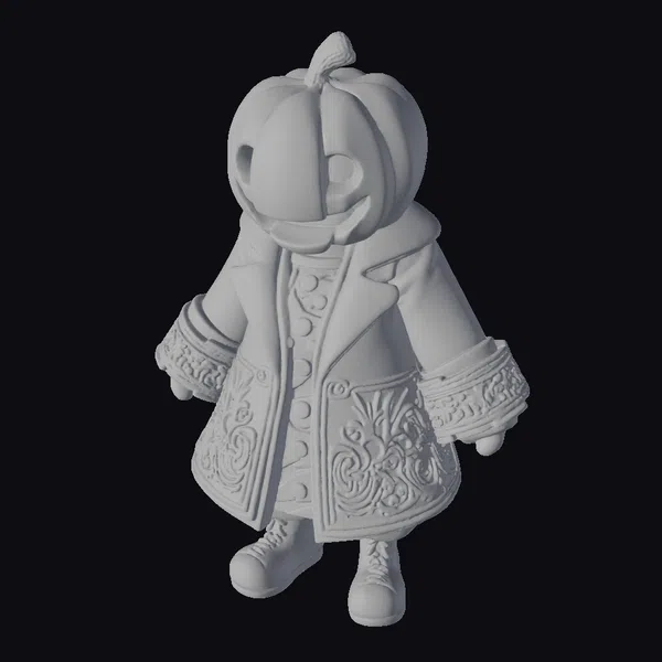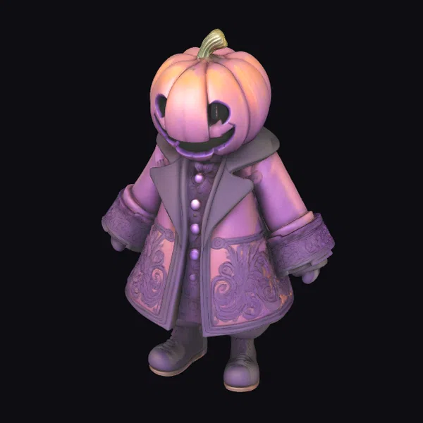 Detailed with precision, this stylized purple pumpkin character stands out with its intricately designed coat, complete with ornate patterns and a distinctive collar. The model’s pumpkin head, adorned with a cheerful smile and triangular eyes, sits atop a sturdy body, dressed in a buttoned coat and boots. The overall design exudes a playful, fantastical vibe, perfect for adding a touch of Halloween magic to games, animations, or designs. Its vibrant purple hue and cartoonish style make it an eye-catching addition to any project.