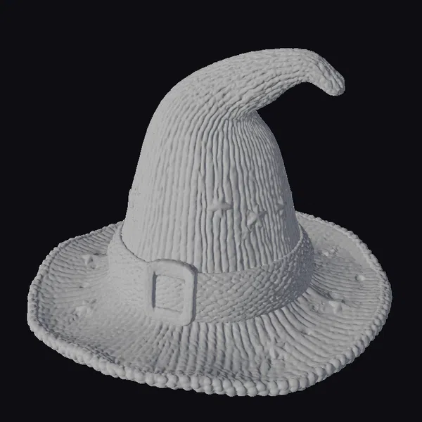 Perched atop a sturdy black band, the curved tip of this purple witch hat reaches for the sky, as if guiding the wearer through mystical realms. The hat’s body is a mesmerizing dance of purple and black stripes, punctuated by a scattering of golden, bronze, and white stars that add a touch of celestial magic. A silver buckle gleams at the base of the band, adding a dash of sophistication to the overall design. The brim of the hat is wide and sturdy, with a delicate pattern of small stars and a subtle texture that suggests a soft, knitted fabric. This hat is perfect for those who weave magic, tell tales, or simply wish to add a dash of fantasy to their world. Ideal for games, 3D printing, VR/AR experiences, animation, and design projects.