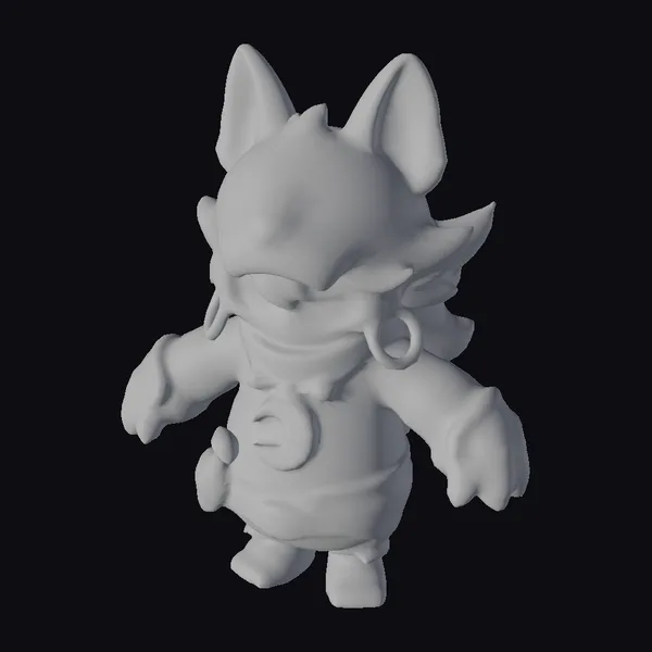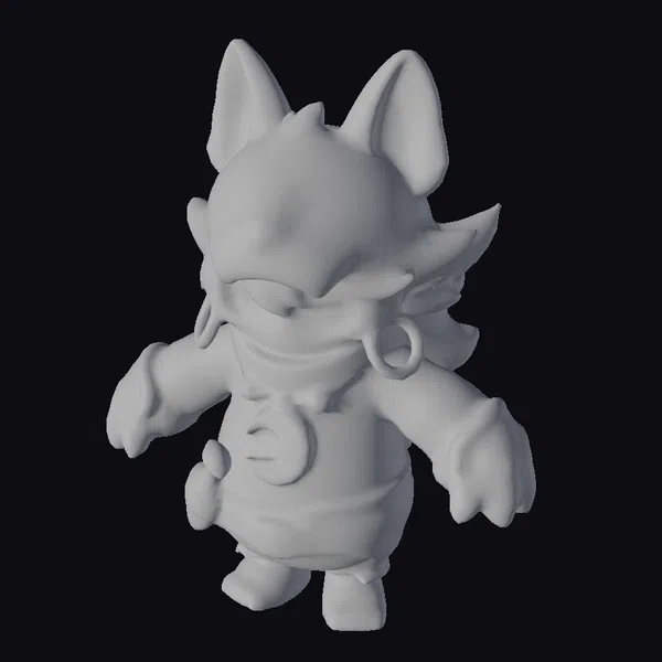 Standing with an air of mystique, this character boasts a detailed purple wolf mask with glowing blue accents and a distinctive crescent moon pendant around its neck. The model’s stylized appearance, complete with oversized ears and a dynamic pose, invites imagination and creativity. The combination of purple, blue, and gold elements, along with glowing green eyes, creates a visually striking effect. Ideal for use in animations, games, or virtual reality experiences, this character model brings a touch of fantasy and adventure to any project.