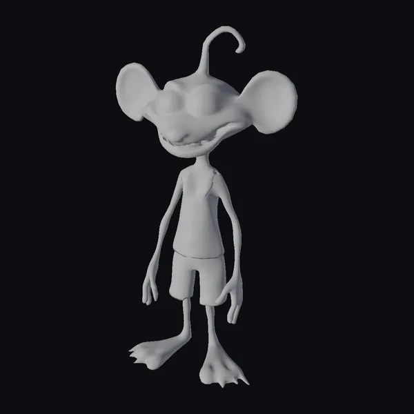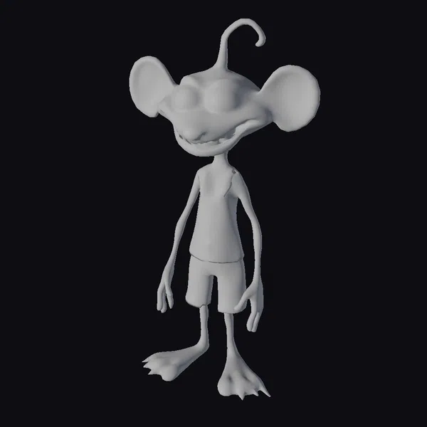 Standing with a relaxed posture, this quirky character boasts a unique blend of mouse-like features and cartoonish exaggeration. Its pink skin is complemented by a yellow tank top and dark shorts, while its oversized ears and curled, antenna-like protrusion on its head give it an endearingly bizarre appearance. The character’s large, white eyes are full of expression, and its wide, cheerful smile invites engagement. This model is perfect for projects requiring a lighthearted, humorous touch, such as animations, games, or children’s content. Its rigging allows for a range of poses and expressions, making it versatile for various creative applications.