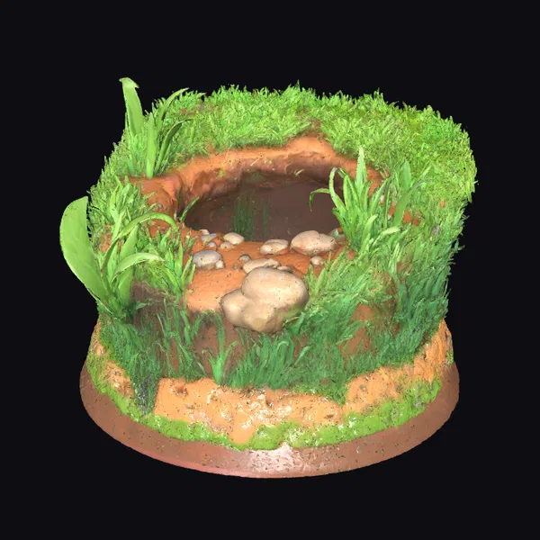 Nestled among vibrant green grasses and plants, this rabbit burrow entrance invites you into a natural, earthy world. The intricate details of the dirt, scattered rocks, and varying textures of the grass create a realistic and immersive scene. Ideal for enhancing games, animations, or virtual reality experiences with authentic natural settings. The blend of serene and wild elements captures the essence of a peaceful outdoor habitat.