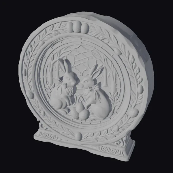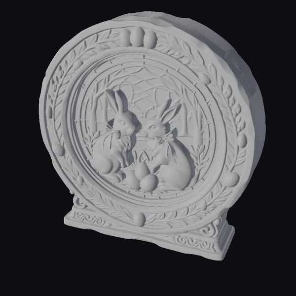 Delicately rendered in a stained-glass style, this captivating scene showcases two endearing rabbits positioned amidst a cluster of eggs and verdant foliage. The rabbits, adorned with colorful bow ties, are set against a beautifully crafted backdrop of interwoven glass pieces, evoking a sense of serenity and wonder. The frame, embellished with leaves and eggs, adds an extra layer of intricacy and charm. This model is perfect for enhancing games, 3D prints, VR/AR experiences, animations, or designs with a touch of whimsy and seasonal flair.