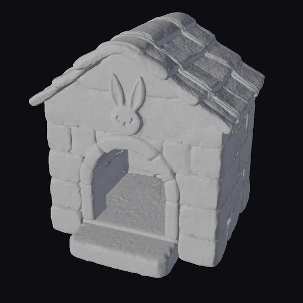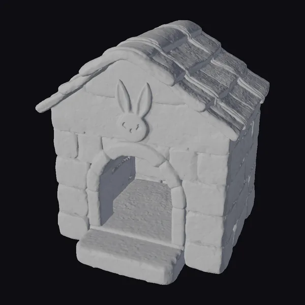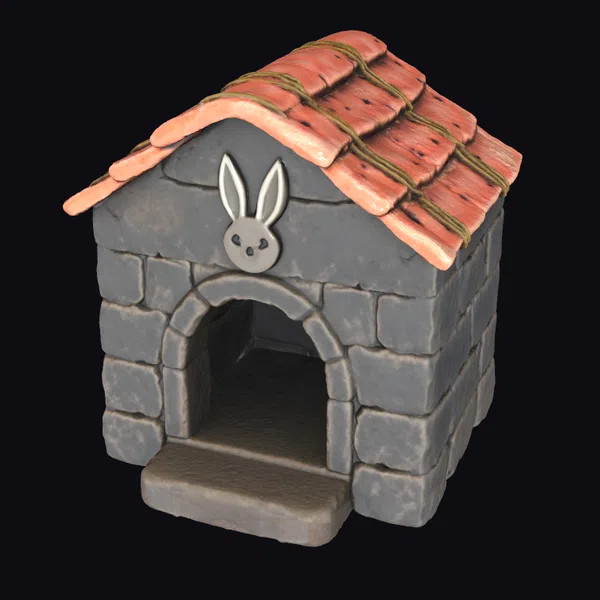 Nestled among the stones, the rabbit shelter boasts a sturdy gray stone base with a slightly ajar doorway, beckoning you to peek inside. The roof, composed of rustic red tiles held together by green twine, adds a pop of color and texture. A stylized rabbit face adorns the front, complete with long ears and a sweet expression. The shelter’s proportions are perfectly balanced, making it an ideal model for games, animation, or 3D printing. Its whimsical design and cute details evoke a sense of fantasy and playfulness, perfect for bringing a touch of magic to your projects.