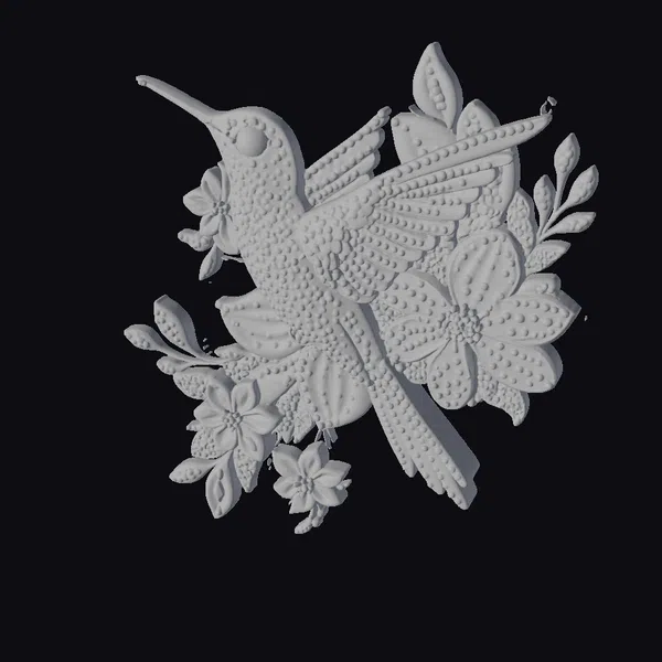 In a stunning display of color and craftsmanship, this hummingbird sculpture is poised elegantly among vibrant flowers, its body a dazzling mosaic of blues, greens, purples, and golds. The intricate textures of the hummingbird’s feathers and the delicate petals of the flowers are accentuated by a subtle metallic sheen, suggesting the reflective quality of wet, dewy surfaces. The sculpture’s base is not visible, giving the impression that this beautiful creature and its floral haven are floating in mid-air. The detailed rendering of the hummingbird’s long, slender beak and its wings, caught in mid-flutter, adds a sense of movement and life. This piece would be perfect for enhancing 3D environments, animations, or print projects with a touch of whimsy and natural beauty. Its detailed features and vibrant colors make it an excellent choice for artists and designers looking to add a unique element to their work.