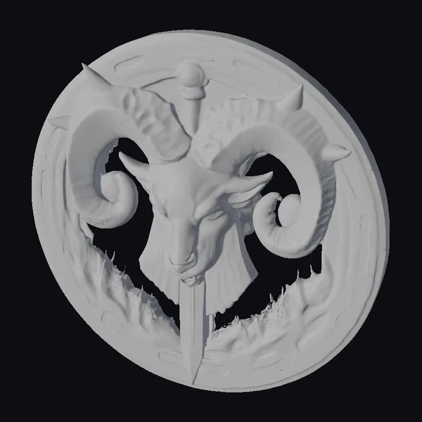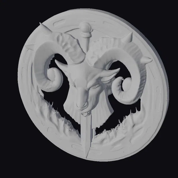 Intricately detailed, the Ram Head Emblem showcases a stunning ram’s head at its core, rendered in lustrous gold with meticulously crafted horns that spiral outward with authority. The emblem is encircled by a ring of vibrant, orange flames that seem to flicker with an inner fire, adding a dynamic sense of energy. A sharp, metallic sword plunges through the center, its point lost in the inferno below, suggesting themes of sacrifice and valor. The entire scene is set against a backdrop of ornate, gold detailing that frames the emblem with an air of nobility. Ideal for use in games, 3D printing, VR/AR experiences, and animation projects seeking a symbol of strength, courage, and the zodiac sign Aries.