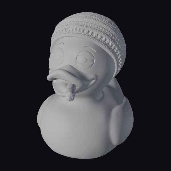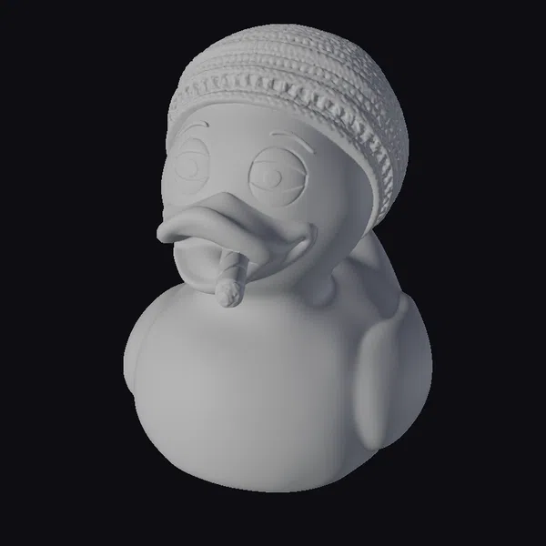 This detailed 3D model of a rasta duck showcases a delightful blend of colors and textures. The duck’s yellow body is adorned with intricate, multicolored tattoos on its shoulders, while its head is wrapped in a striped beanie, complete with a subtle sheen to mimic the fabric’s texture. The duck’s facial features are exaggerated for a cartoonish appeal, with large, expressive eyes and a cheerful orange beak. A small cigar rests between its beak, adding a touch of whimsy. This model is perfect for projects requiring a fun, playful character, such as animations, games, or 3D printing. Its high-quality details make it suitable for close-up shots or as a decorative piece.