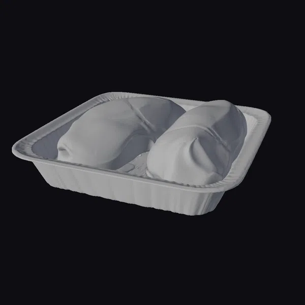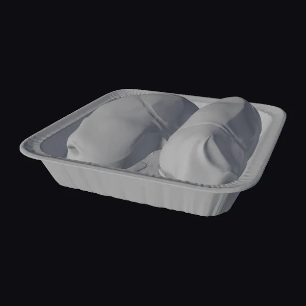 Rendered in exquisite detail, this 3D model showcases a tray pack of raw chicken breasts, accurately capturing the texture of the pink meat, the sheen on the surface, and the subtle details of the packaging. The white polystyrene foam tray with a raised lip and absorbent pad provides a realistic base for the 2-3 chicken breasts, which are carefully arranged to mimic a generic supermarket display. Ideal for use in advertising, educational materials, or film and video game environments where realistic food presentation is crucial.