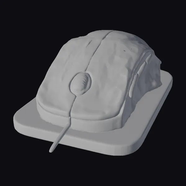 Detailed to perfection, this meatware mouse boasts a realistic raw meat appearance, complete with intricate marbling and texture. The mouse is positioned on a white mousepad, with the cord neatly extending outwards. The silver scroll wheel and gray side buttons provide a sophisticated contrast to the organic, meaty design. This unique model is perfect for adding a touch of whimsy to game development, 3D printing projects, or animation assets. Designers and artists can also use this model to create eye-catching promotional materials or concept art.