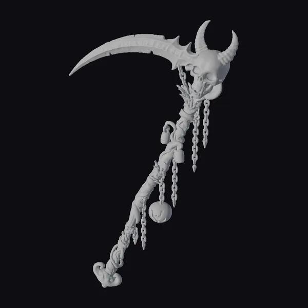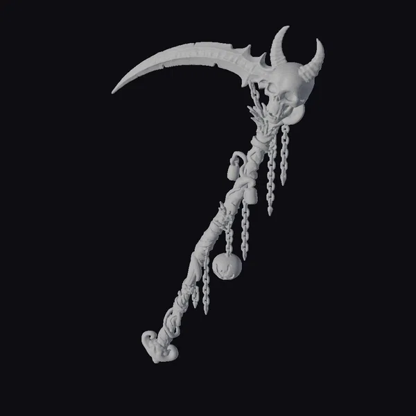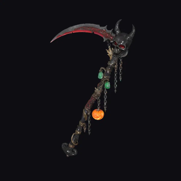 Crafted with meticulous attention to detail, this scythe boasts a curved, dark blade with a subtle red glow emanating from within. The handle, wrapped in twisted metal and adorned with chains, appears worn and battle-hardened. A demonic skull with glowing red eyes sits atop the scythe, as if channeling dark energies. Green and orange accents add a touch of mysticism, while the overall design exudes a sense of foreboding. Ideal for use in games, 3D printing, VR/AR experiences, animation, and design projects seeking a haunting, dark fantasy element.