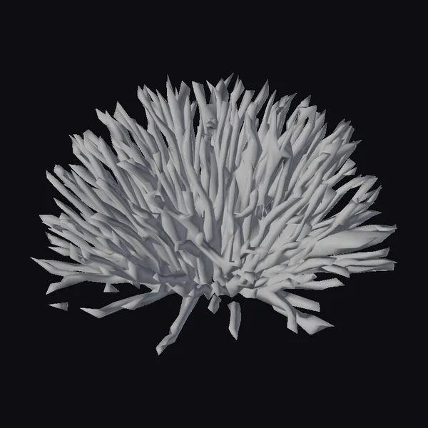 Positioned in a dynamic, sprawling pose, the red algae cluster showcases its intricate network of thin, pointed fronds. These vary in length and angle, creating a sense of movement and depth. The texture of each frond is finely detailed, with a subtle gradient of red hues that evoke a sense of natural lighting. This model is perfect for projects requiring realistic marine environments, such as animations, games, or virtual reality experiences focused on oceanic ecosystems. Its detailed structure and natural appearance make it an excellent choice for designers and artists seeking to add authenticity to their underwater scenes.