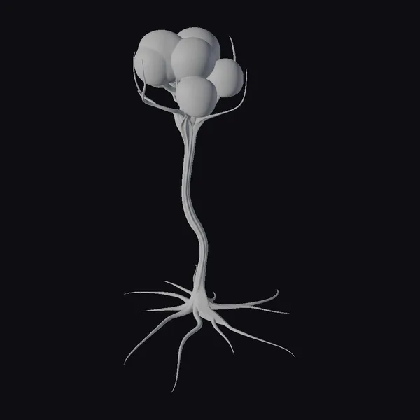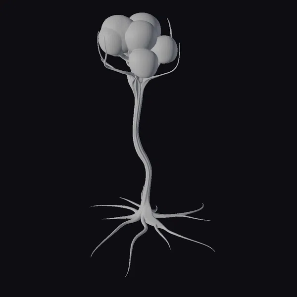Perched atop a slender, elongated stem, a cluster of vibrant, crimson globes pulsates with an otherworldly energy. The stem, a deep, rich black, twists and turns like a living entity, leading down to a base from which numerous, spindly roots extend, evoking the image of skeletal fingers grasping for sustenance. The globes themselves, ranging in size and hue, seem to radiate an inner light, casting a subtle glow on the surrounding environment. This striking, sci-fi plant model is perfect for adding a touch of the extraterrestrial to games, animations, or 3D scenes. Its unique blend of dark, gothic roots and luminescent, red crowns makes it an eye-catching addition to any project.