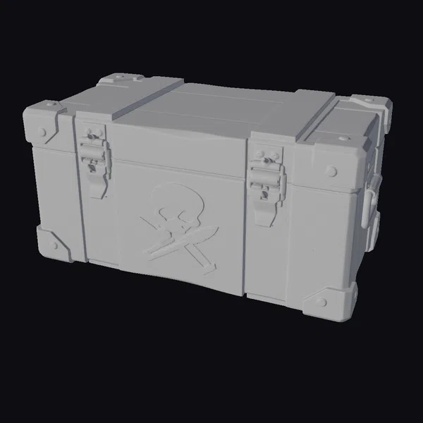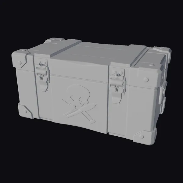 Positioned at a dynamic angle, the red ammo box showcases its robust design, complete with metallic corners and clasps that exhibit a weathered, rusty patina. The bold, silver emblem on the front—a skull and crossbones with a bullet—commands attention, suggesting the contents are not for the faint of heart. The box’s surface is marked with scratches and scuffs, lending it a battle-hardened appearance. Ideal for projects requiring a prop that exudes a sense of peril or urgency, such as game environments, cinematic scenes, or virtual reality experiences.