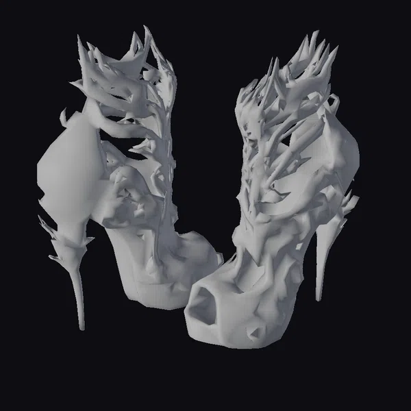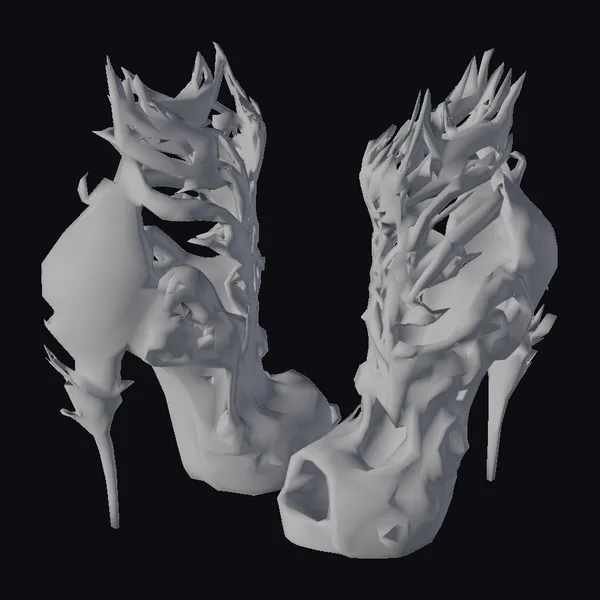 These striking red and black stiletto heels are a marvel of fashion design, combining the elegance of high fashion with the boldness of gothic and stylized elements. The shoes feature a vibrant red base with an intricate pattern, elevated by a high heel and accented with black, spiky details that resemble organic growths. The design is both dramatic and stylish, making these shoes perfect for those who dare to make a statement. The detailed texture and unique design elements make these shoes suitable for various applications, including game character design, animation projects, VR/AR experiences, and even architectural visualizations where fashion and style are key.