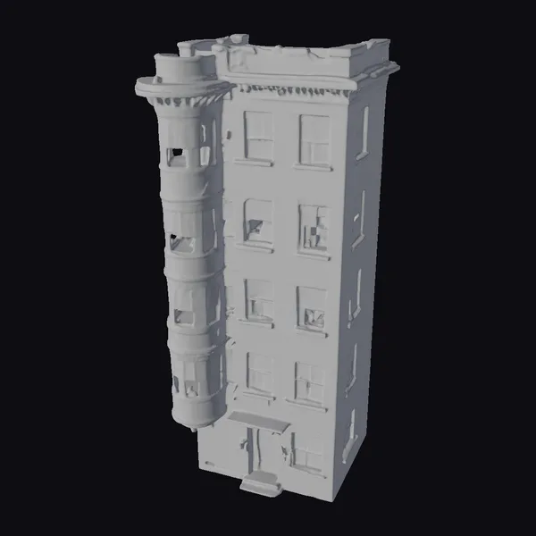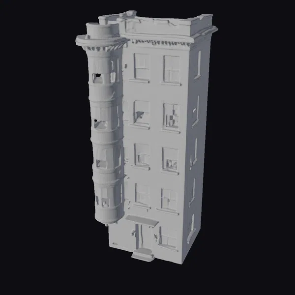 Detailed with precision, this 3D model of a red brick apartment building showcases a realistic and weathered exterior. The building’s pose highlights its multiple floors, each adorned with numerous windows that vary in their state of openness and the presence of curtains or blinds. A notable feature is the rounded turret that extends from one side, adding a touch of architectural uniqueness. The textures and lighting emphasize the aged appearance of the brick and the worn look of the windows and door. The model is versatile and can be used in various projects, such as architectural visualizations, urban planning simulations, game environments, or even augmented reality experiences. Its realistic style makes it suitable for projects aiming to depict everyday urban settings or specific narratives set in city environments.