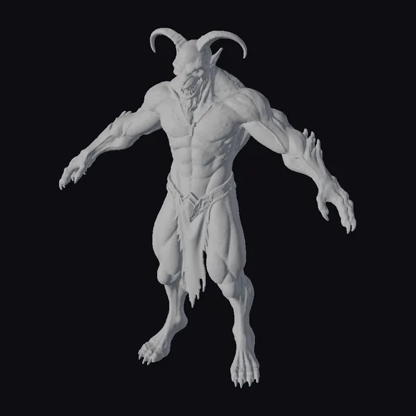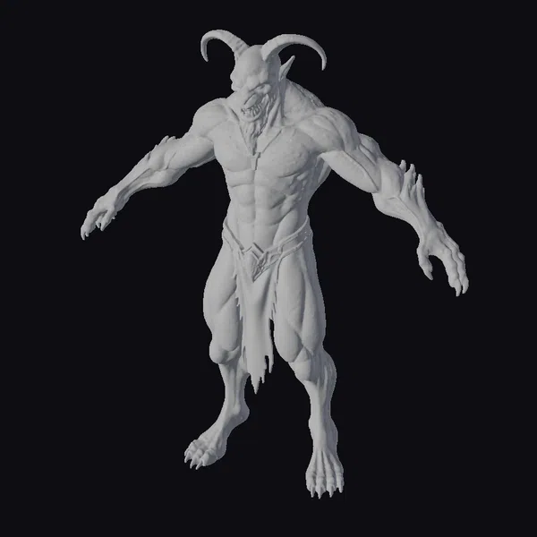 Standing tall with an imposing presence, this red demon’s physique is defined by bulging muscles and sharp, black horns that curve menacingly from its forehead. Its hands end in long, claw-like nails, and a black loincloth with a decorative belt accentuates its powerful stance. The model’s red skin has a slightly shiny texture, suggesting a life-like appearance. The demon’s facial features are chiseled, with a sharp jawline and pointed ears, contributing to its fearsome appearance. This model is perfect for projects requiring a formidable, otherworldly creature, such as fantasy games, animations, or horror-themed designs.