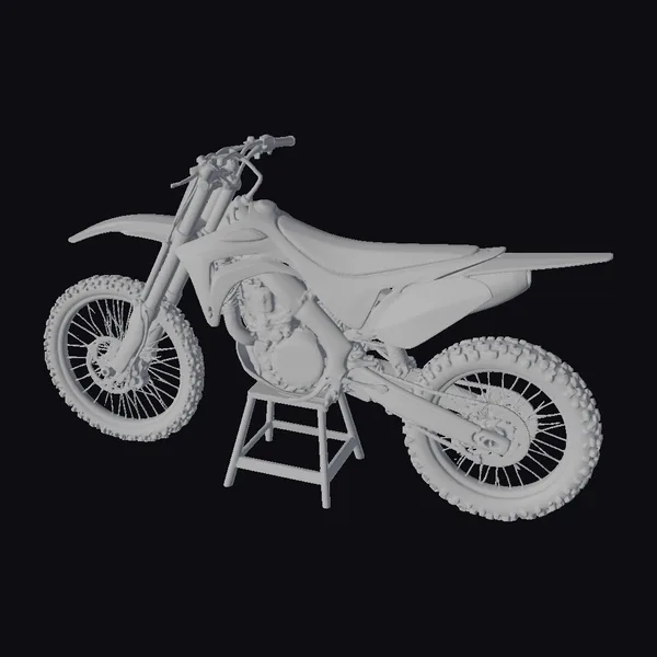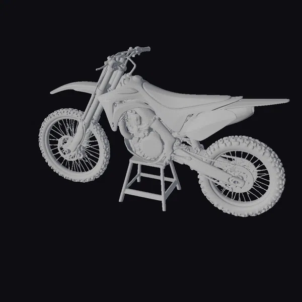 Positioned dynamically on a metallic stand, the dirt bike boasts a striking red and black color scheme with metallic silver accents. Its front wheel is turned slightly to the left, showcasing the bike’s aggressive stance and detailed design. The tires are thick and rugged, designed for off-road adventures. The bike’s body is adorned with a mix of red, black, and silver decals, adding to its racing aesthetic. Ideal for use in games, 3D printing, VR/AR experiences, and animation projects, this model brings a sense of speed and adrenaline to any scene.