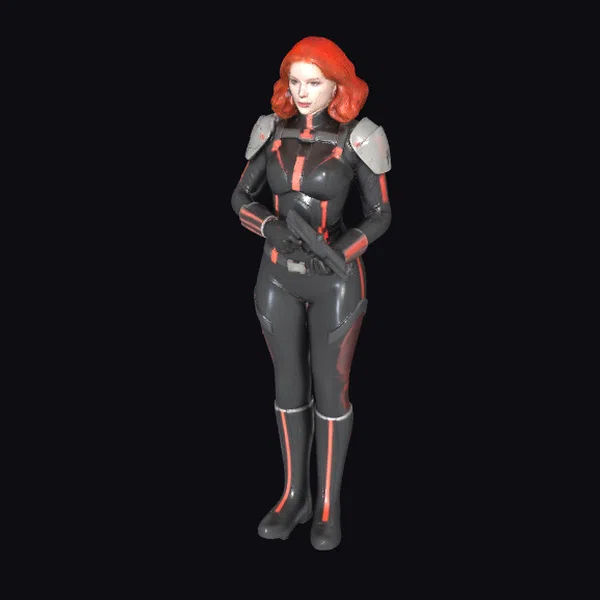 Detailed with precision, the female warrior’s pose showcases her powerful stance, with one hand resting on her hip and the other holding a gun, exuding a sense of readiness. The sci-fi armor is meticulously designed with black and red accents, highlighting a futuristic aesthetic. The model’s facial features are finely tuned, capturing a look of determination. Her red hair is styled in loose waves, adding to her commanding presence. The armor includes detailed elements such as shoulder pads, gloves, and boots, all contributing to a cohesive and protective outfit. This model is perfect for projects requiring a strong, futuristic character, suitable for games, animation, print, VR/AR, and design applications.