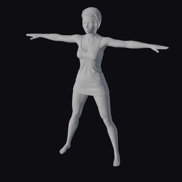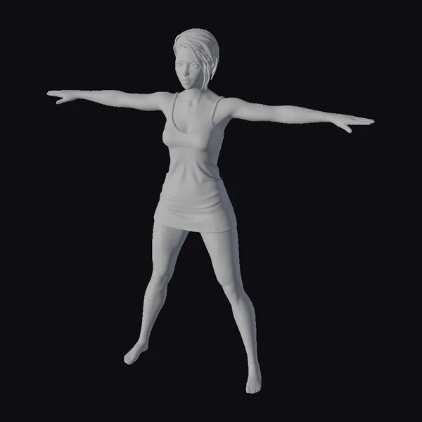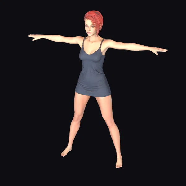 This detailed 3D model showcases a woman with striking red hair, posed with her arms extended out to the sides and her legs shoulder-width apart. She wears a short, sleeveless gray dress that highlights her physique. The model’s facial features are delicately rendered, contributing to a realistic and engaging appearance. The pose suggests balance and strength, making this model suitable for various applications, including games, animation, virtual reality (VR), and augmented reality (AR) projects, as well as design and print media.