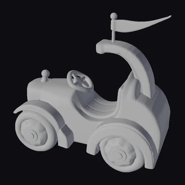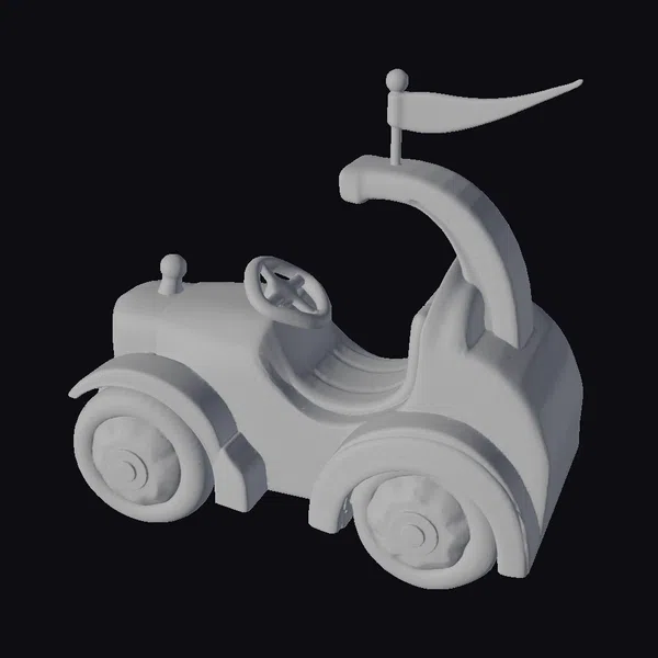 Positioned dynamically with its front end angled to the left, this adorable toy car boasts a sturdy build with a predominantly red body that gradates to a warm orange on the hood and seat. The gray wheels and accents provide a sleek contrast, while the black steering wheel adds a touch of sophistication. A small flag mounted on a curved gray pole above the driver’s seat flutters as if in mid-motion, capturing the essence of speed and adventure. The car’s smooth lines and rounded edges evoke a sense of nostalgia, reminiscent of classic children’s toys. Perfect for 3D rendering in children’s games, animations, or even as a decorative piece, this model promises to bring a smile to any setting.