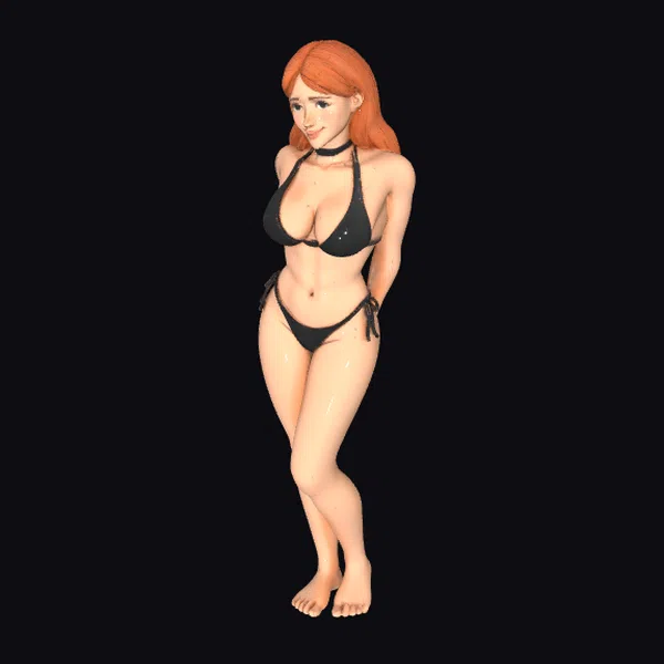 Posing with confidence, this stylized 3D model of a redhead woman showcases a perfect blend of style and allure. Her vibrant red hair cascades down her back, complementing her sun-kissed skin and the sleek black bikini she wears. The model’s pose, with hands behind her back and legs slightly crossed, exudes a sense of casual confidence. Her facial features are accentuated with a subtle makeup look, enhancing her natural beauty. The detailed textures of her skin and hair add a layer of realism to her stylized appearance. This model is perfect for projects that require a touch of summer vibes, from animation and games to design and advertising.