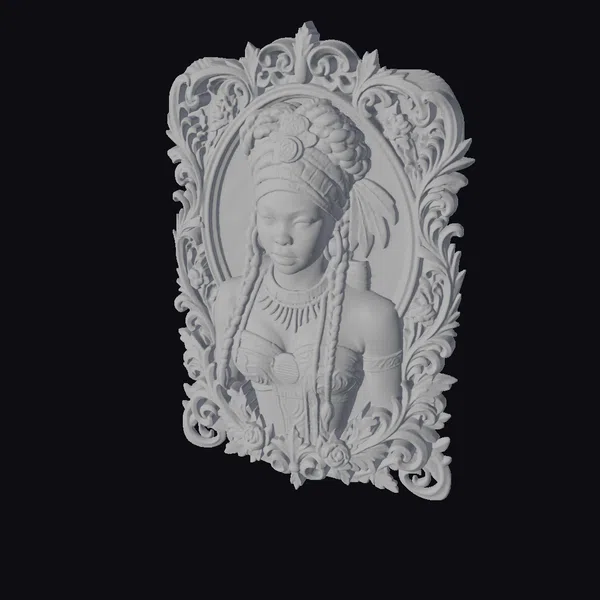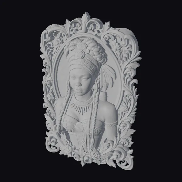 This stunning 3D portrait features a regal African queen with braided hair, elegantly dressed in a colorful outfit and accessorized with gold jewelry, including hoop earrings and a layered necklace. The queen’s serene expression is set against a softly illuminated background, accentuating her dignified presence. The ornate frame, adorned with floral patterns and green leaves, adds a touch of opulence to the overall piece. Ideal for use in games, animation projects, VR/AR experiences, and design applications where a symbol of majesty and cultural richness is desired.