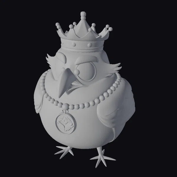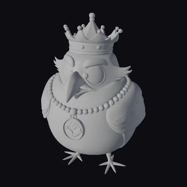This stylized bird figurine stands proudly, its teal and white plumage complemented by a glittering silver crown atop its head. A string of pearls encircles its neck, and a large, shiny pendant hangs from its chest, catching the light. The bird’s golden beak and feet add a touch of luxury to its already majestic appearance. The intricate details, from the texture of its feathers to the sparkle of its accessories, make this model perfect for use in games, 3D printing, VR/AR experiences, animation, and design projects where a touch of fantasy and elegance is desired.