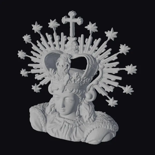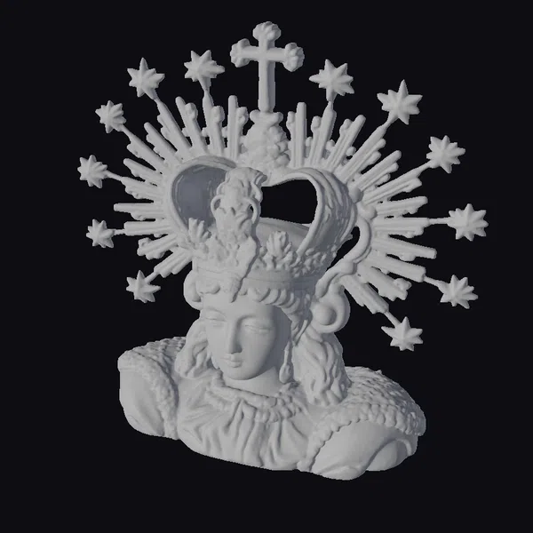 This stunning 3D model presents a regal female bust, crowned with an ornate golden crown that commands attention. The crown, embellished with precious stones and a cross at its apex, sits atop a cascade of dark, flowing locks. The bust itself is draped in a white and blue ensemble, featuring delicate lace trim that adds a touch of refinement. A halo of golden starbursts surrounds the crown, imbuing the piece with an otherworldly aura. Crafted with meticulous attention to detail, this model is perfect for use in historical or mythological contexts, 3D printing, virtual reality experiences, or as a striking decorative piece.