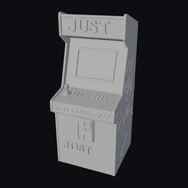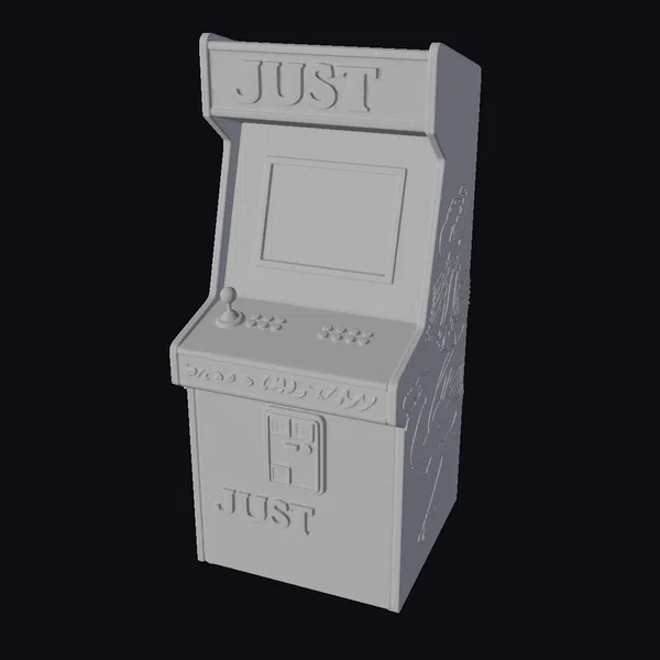 In a dynamic pose, this retro arcade machine showcases its eye-catching design, complete with a bright yellow outline that accentuates its bold graphics. The ‘JUST’ logo emblazoned on the top and front panels seems to leap off the surface, set against a backdrop of swirling flames and radiant lights. The machine’s control panel, equipped with a joystick and colorful buttons, beckons gamers to immerse themselves in the classic gaming experience. High-quality textures and lighting effects bring this 3D model to life, making it perfect for projects requiring a nostalgic touch, such as game development, animation, or architectural visualization.