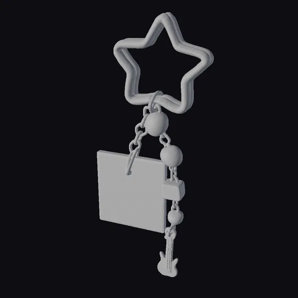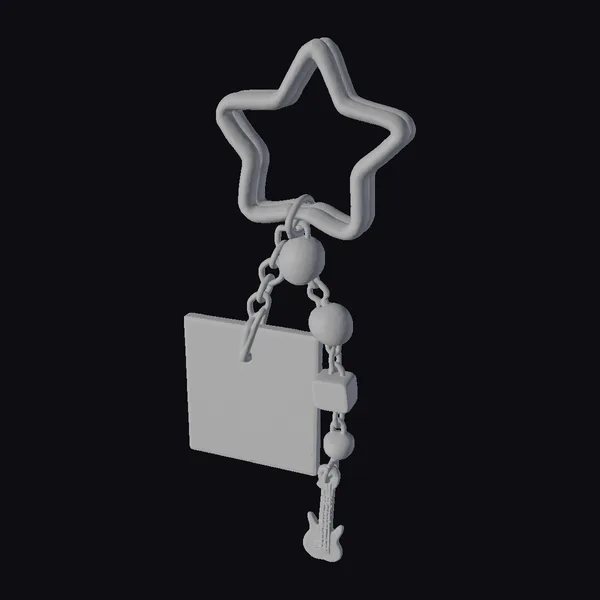 Detailed with precision, this keychain boasts a star-shaped topper that adds a touch of whimsy. A colorful array of beads in shades of pink, orange, and purple dangles enticingly, accompanied by a cartoon-style charm depicting a lively scene. The charm itself showcases a person with a guitar, set against a vibrant background. The overall design exudes a carefree, retro charm. Ideal for adding a pop of personality to any setting, this keychain can be used in various contexts such as games, 3D printing projects, VR/AR experiences, animations, or design projects.