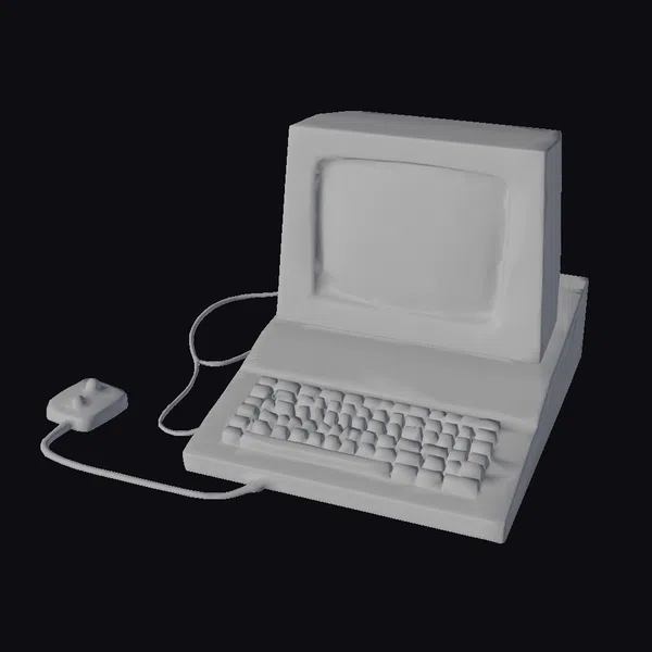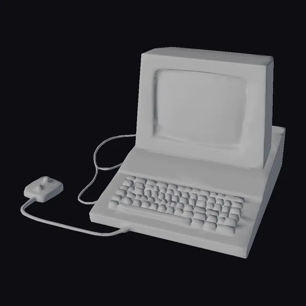 Perched on a sturdy base, the computer’s CRT monitor displays a bright green screen with a stylized ‘T’ logo, adding to the retro charm. The keyboard, with its tactile keys and chunky design, sits below the monitor, accompanied by a simple yet iconic mouse with red buttons. The overall design exudes a sense of nostalgia for the dawn of the personal computer era. This model would be perfect for use in retro-themed games, animations, or designs looking to evoke a sense of vintage tech. Its detailed textures and accurate proportions make it an excellent choice for projects requiring a realistic retro computer aesthetic.