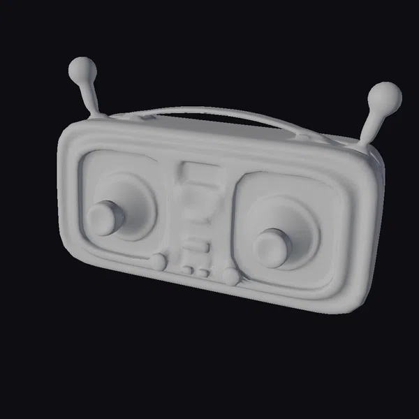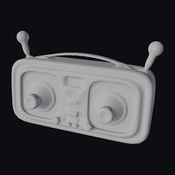 Perched on a sleek, turquoise body, two large, silver dials dominate the front of this retro-futuristic electronic receiver, surrounded by a series of buttons and knobs that add to its playful, cartoonish charm. The device’s glossy finish reflects light, accentuating its bold, futuristic design. Two antennae rise from the top, giving it a quirky, endearing appearance. The model is perfect for use in games, 3D printing projects, VR/AR experiences, animations, or design visualizations where a touch of nostalgia and futurism is desired.