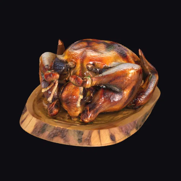 In a stunning display of culinary art, a succulent roasted turkey takes center stage, its golden-brown skin glistening with a subtle sheen that hints at its juicy tenderness. The turkey is elegantly presented on a natural wooden platter, its surface adorned with a rich pattern of darker wood tones that add warmth and texture to the overall presentation. The pose, with the turkey slightly angled to showcase its perfectly glazed surface, invites the viewer to imagine the aromas and flavors that come with it. This 3D model is perfect for designers and creators looking to add a touch of realism and festivity to their projects, whether for animation, games, or architectural visualization. Its detailed textures and lifelike appearance make it an excellent choice for any project that aims to capture the essence of a Thanksgiving feast or a cozy dinner gathering.