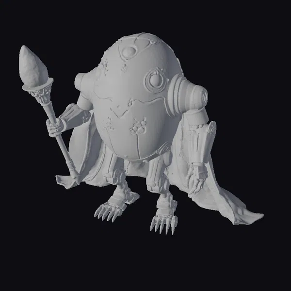 In a majestic pose, the robotic egg-shaped mage stands with its metallic shell gleaming in shades of blue and gold. The shell is intricately engraved with glowing runes and circuit-like symbols that pulse with an otherworldly energy. Two small mechanical arms protrude from the sides, one grasping a glowing tome while the other holds a staff with a fiery orb at its tip. A flowing cape billows behind, adding a touch of drama to the creature’s already imposing presence. The model’s level of detail, from the texture of the metallic shell to the glow of the runes, makes it perfect for use in games, 3D printing, VR/AR experiences, animation, and design projects.