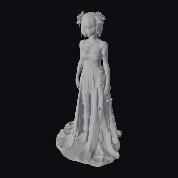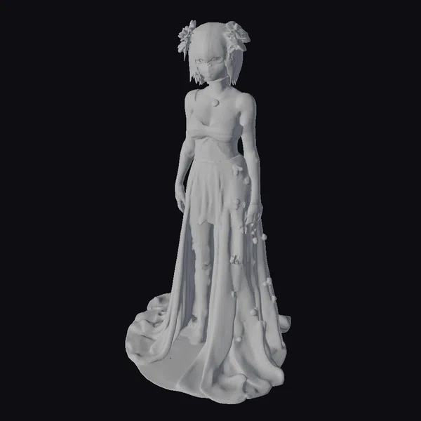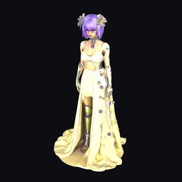 This stunning figure stands with a serene demeanor, her purple hair styled in a chic bob, accented with floral arrangements that dance around her head. Her white dress, flowing and elegant, reveals hints of her robotic nature through green metallic limbs and mechanical details peeking from beneath the fabric. The dress itself is adorned with purple gems and green accents, mirroring the colors of her hair and mechanical parts. Glasses add a touch of sophistication to her face, which is framed by a serene, enigmatic smile. This model is perfect for projects requiring a blend of technology and nature, fantasy and science fiction. It can be used in games, 3D printing, VR/AR experiences, animation, and design projects.
