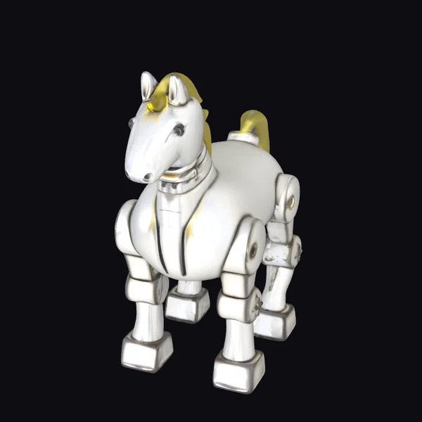 This stunning robotic horse boasts a predominantly white body with gold accents on its mane and tail, set against a clean white background. The model’s mechanical legs and neck are intricately detailed, showcasing a blend of organic and synthetic elements. The horse’s head is turned slightly to the left, giving a sense of dynamic movement. The overall design is a perfect fusion of fantasy and sci-fi elements, making it ideal for projects requiring a futuristic, otherworldly feel. Its high level of detail and unique design make it suitable for various applications, including games, animation, and design projects.