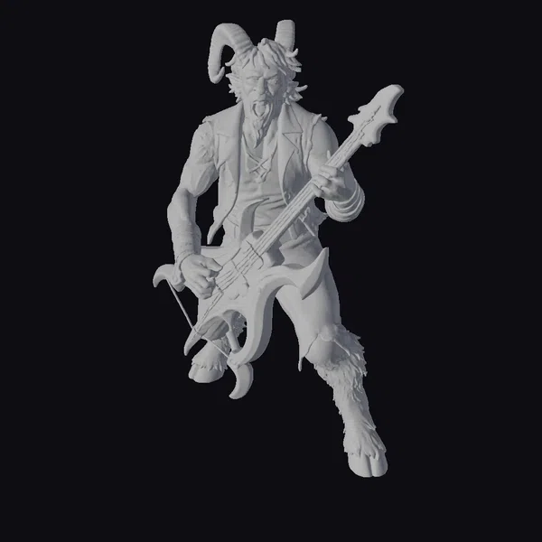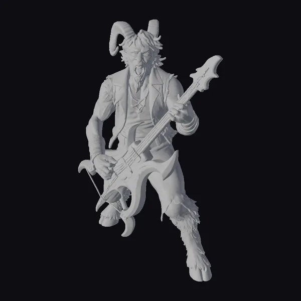 Detailed with precision, this rocking satyr stands in a dynamic pose, his mouth wide open in a fierce scream as he plays a vibrant, flame-shaped guitar. The satyr’s dark hair and beard complement his sharp, curved horns and furry legs, which transition into hooves. His arms are adorned with tattoos and leather cuffs, adding to his wild yet musician-like appearance. The guitar, with its black body and bright orange flames, seems to be an extension of his energetic performance. This model is perfect for projects requiring a mythical, high-energy character, such as animations, games, or fantasy designs.