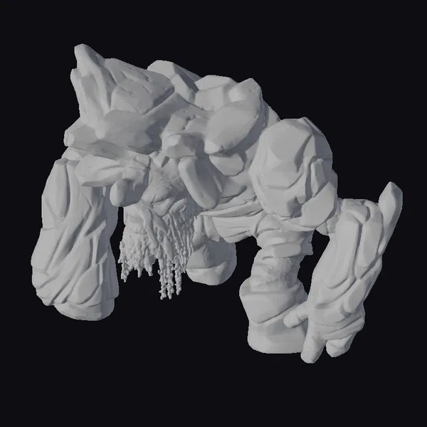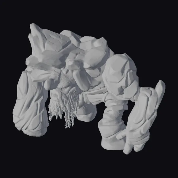 Crafted with meticulous attention to detail, this rocky creature stands out with its imposing stature and intricate texture. The model’s body is a complex arrangement of jagged stone-like protrusions, seamlessly blended with vibrant green moss that drapes over its arms and cascades down its face. The creature’s pose exudes a sense of raw power, as if poised to strike at any moment. Its glowing yellow eyes are a striking feature, providing a stark contrast to the earthy tones of its body. This model is perfect for projects requiring a fantastical, otherworldly element, such as games, animations, or virtual reality experiences.